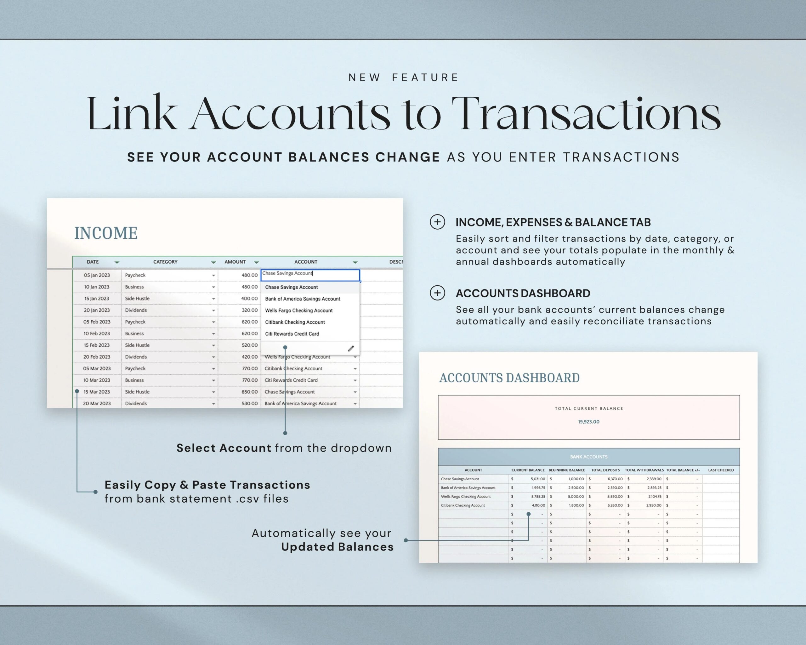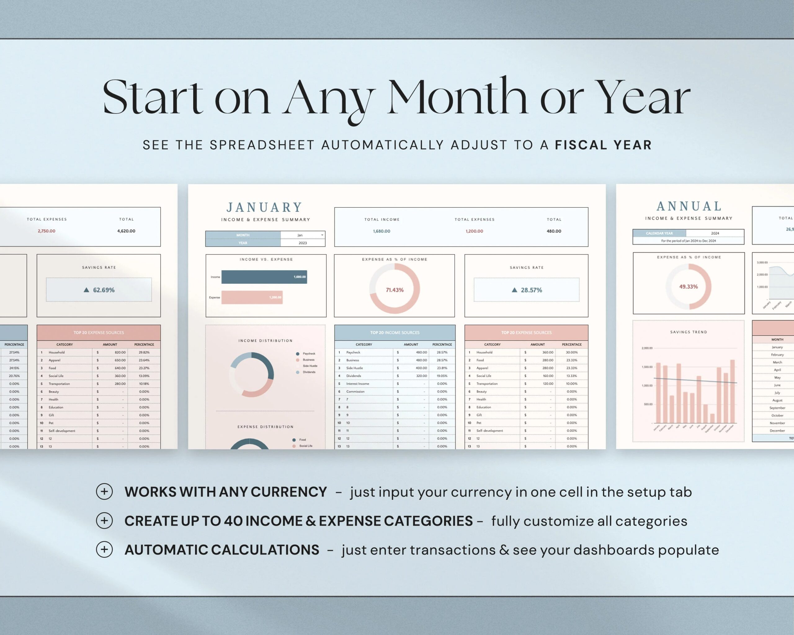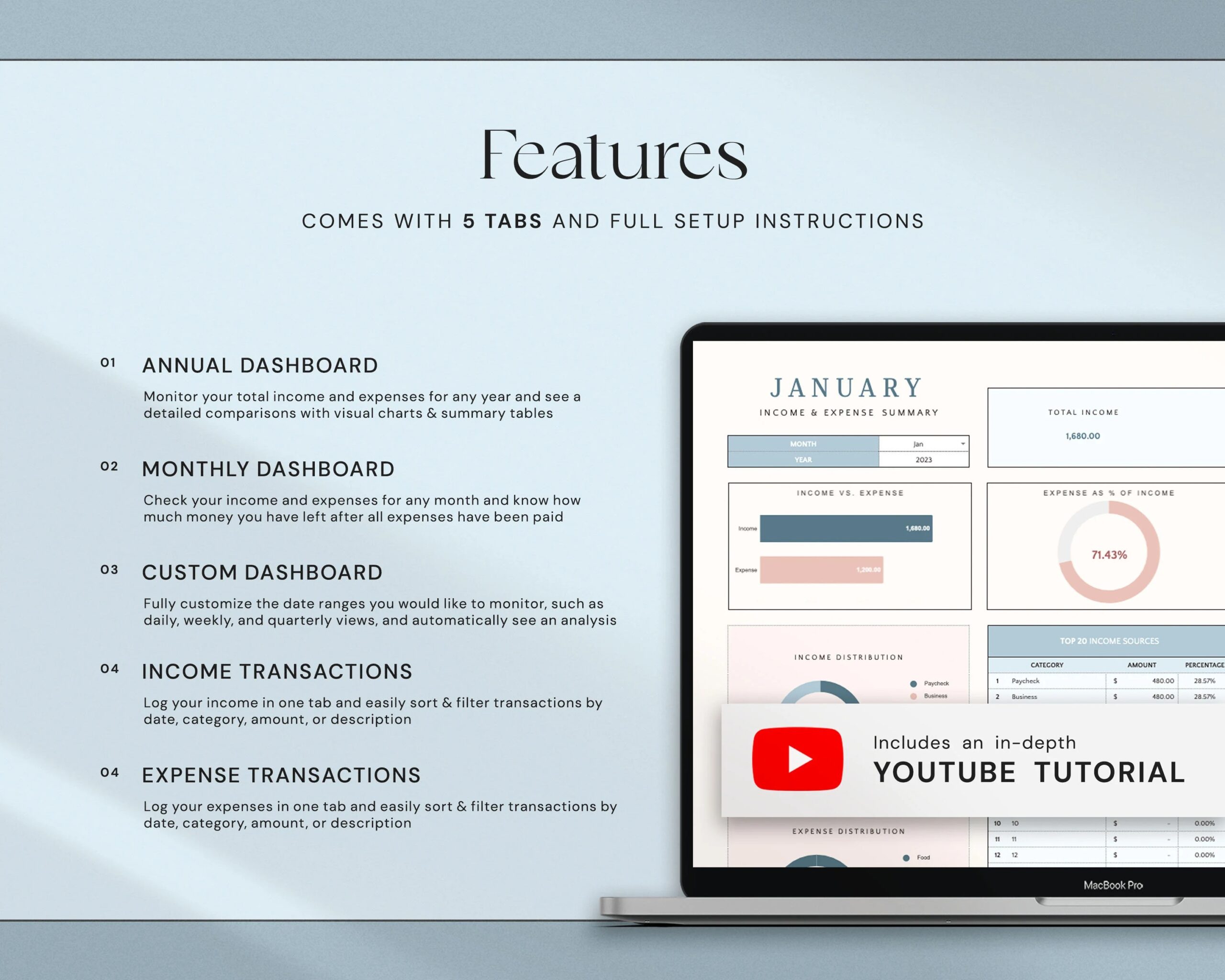 • 7 Spreadsheet Tabs: Monthly Dashboard, Annual Dashboard, Custom Dashboard, Income Transactions, Expense Transactions, Balance Transactions, Setup