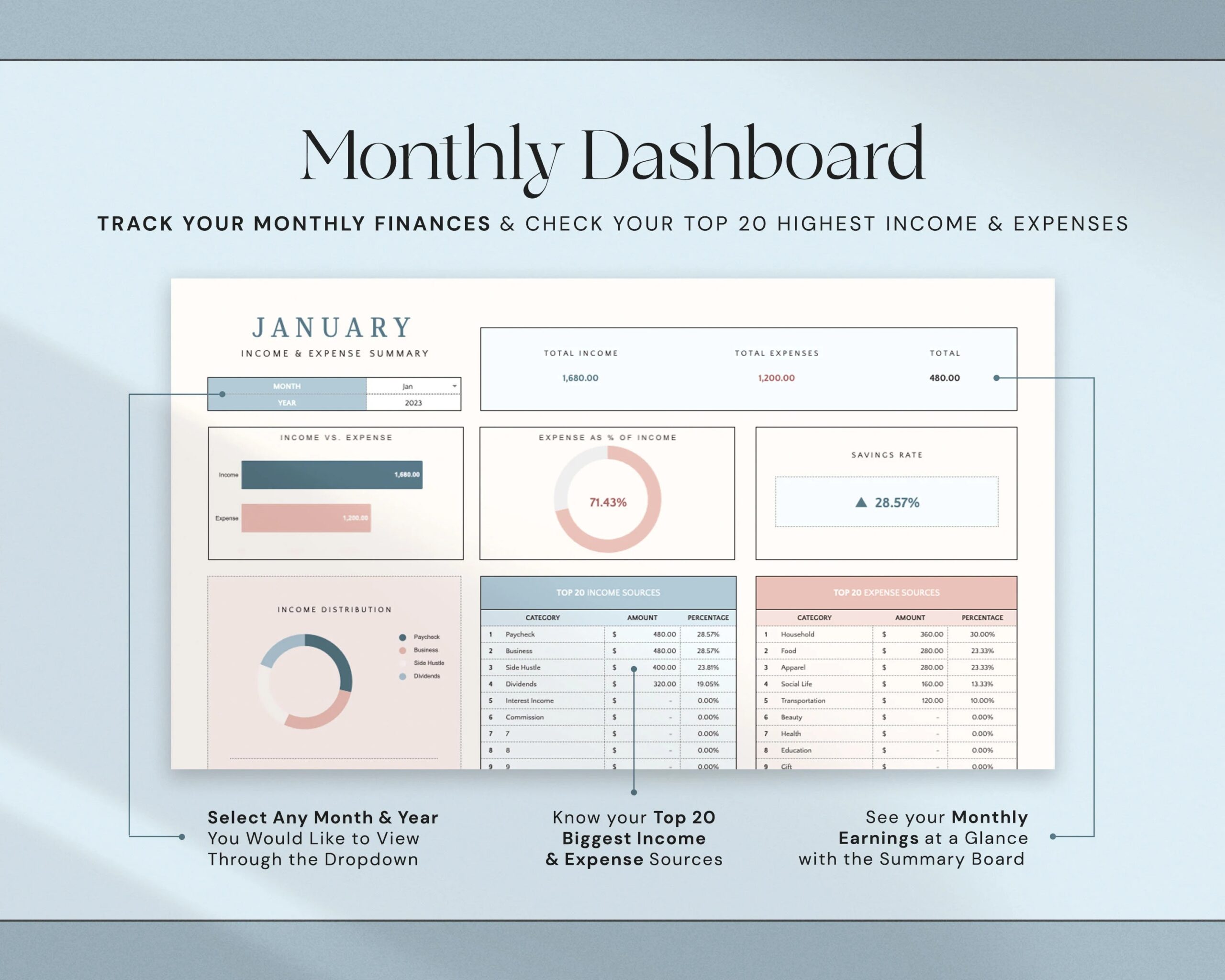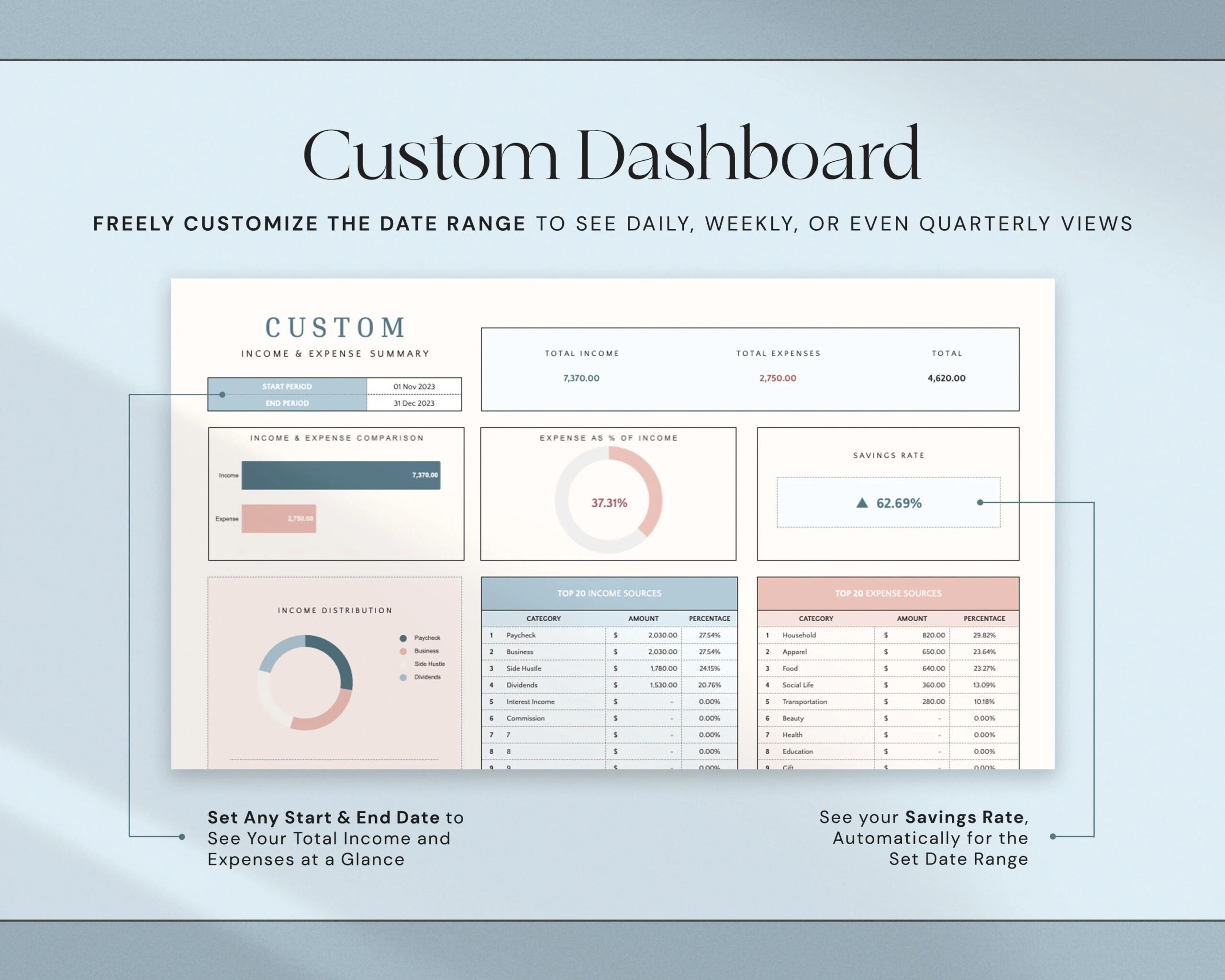 The Income & Expense Spreadsheet is perfect for when you just want to track your total income and expenses and don’t wish to set a budget. Continuously use the same file to see an overview of your finances – just choose between the Annual, Monthly, and Custom Dashboard tabs in the template. Includes only the things you need and is made to be simple, easy to understand, yet visually appealing. All you have to do is input your transactions and everything else is calculated automatically!