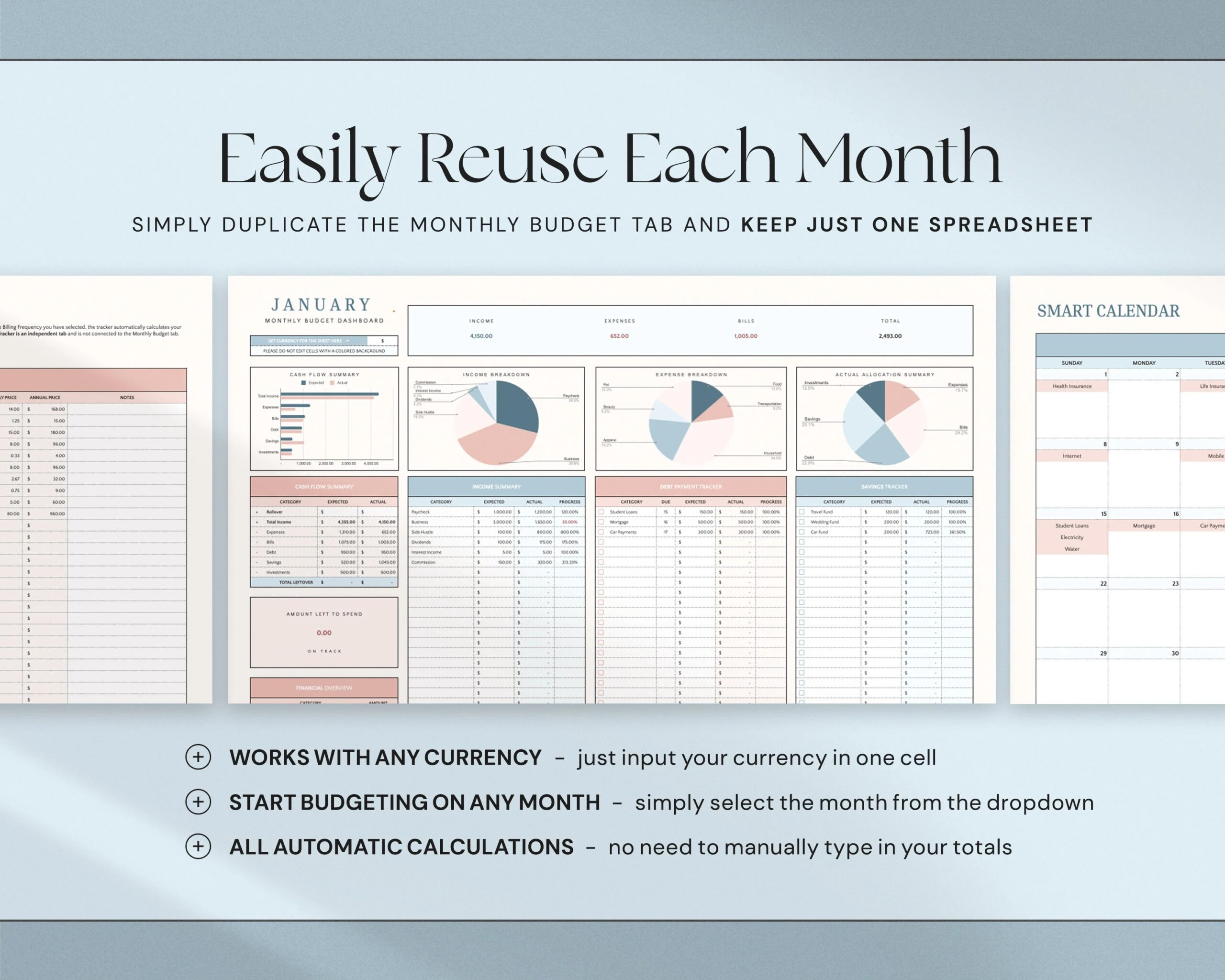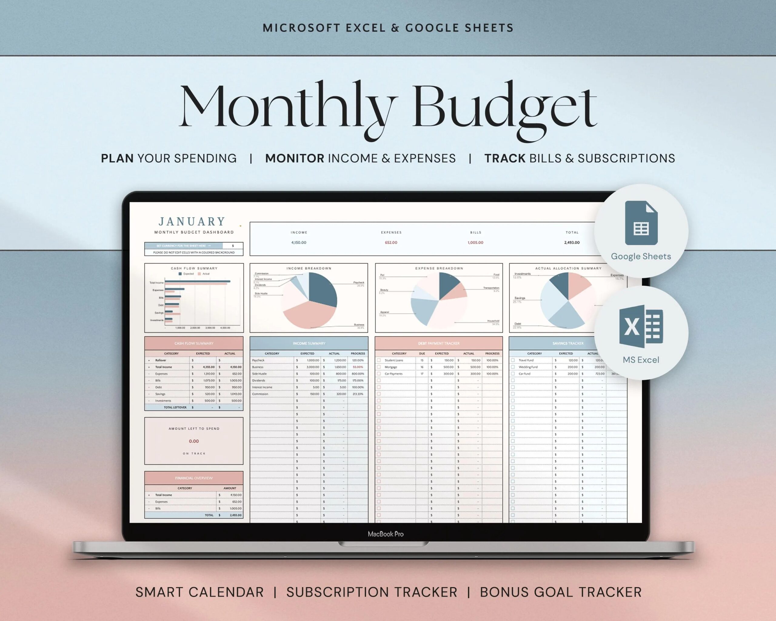 • 3 Spreadsheet Tabs – Monthly Budget Dashboard, Smart Calendar, Subscription Tracker